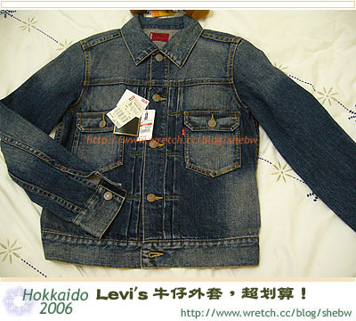 Levi's--其他outlet比較少見,買到超划算的牛仔外套,原本價格是¥11550(台幣約3300左右),Outlet價格是稅入價¥3000元,換算成台幣大約900元。但是別急,不用這麼多錢啦,別忘了還有打八折,我的這件外套,居然只要台幣720元啦