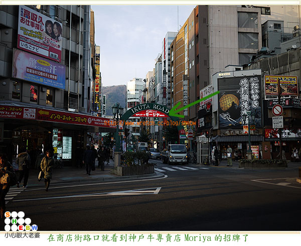 旅遊書推薦的モーリヤ (Moriya)神戶牛專賣店,在神戶三宮商店街(Ikuta Road)入口就看得到モーリヤ的招牌了~~