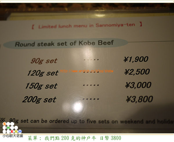 有英文的menu,這是神戶牛套餐三宮店限定的菜單,有分90克、120克、150克、和200克