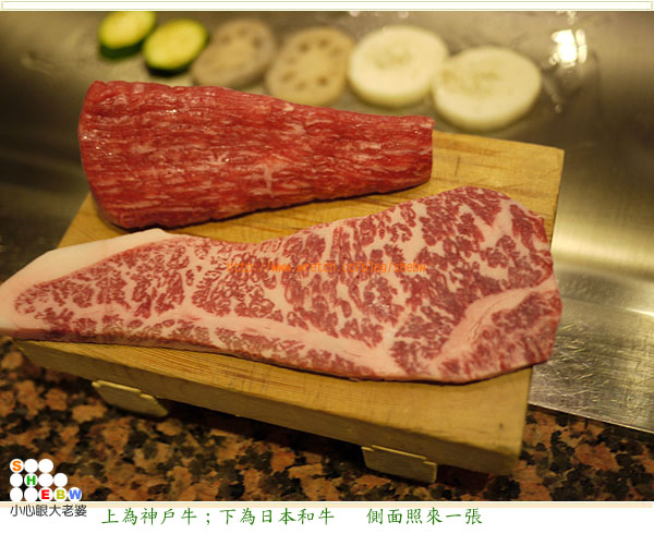 接著,主角上場囉,師傅介紹著,上面是神戶牛,下面是日本和牛,看看那肉的色澤真美,油花分布也相當均勻