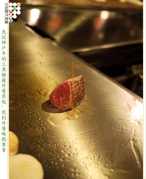 後來師傅又把三角錐給切開,切成一樣大小片,然後每一面都稍微煎到,迅速鎖住肉汁,就馬上放在我們盤子上了