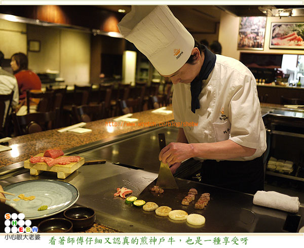 然後,師傅用那鋒利的刀,把神戶牛和日本和牛切開了,取一部分放在溫度超高的鐵板上,發出滋滋作響的聲音