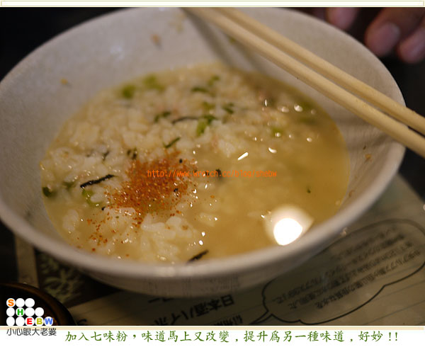 加入哇沙比和七味粉之後,吃一口充滿雞湯和海苔的茶泡飯,整個味道又被提味了,感覺風味更佳。