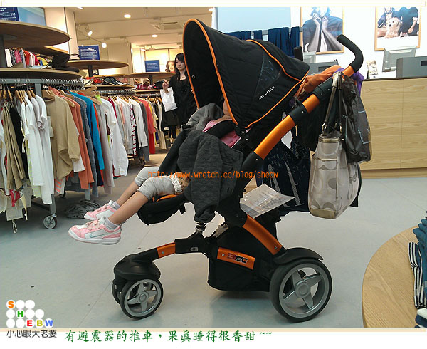 這裡的推車有避震器,而且車架還有烤漆很漂亮,即使在整個outlet園區推,也相當好推,小朋友睡得也香甜,媽媽逛街起來更輕鬆。