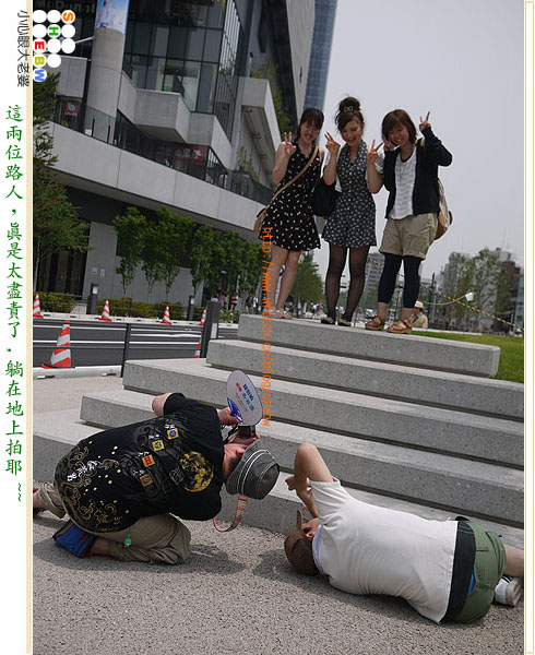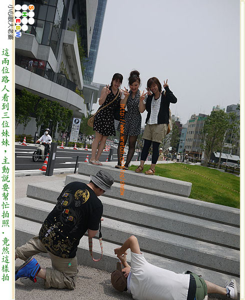 像這三位妹妹,本來是輪流有人蹲在地上幫同伴拍照的,後來出現兩位超熱情路人,主動說要幫他們拍照,而他們竟然拍成這個樣子,整個人都貼地拍照了啦,素昧平生,幫忙拍照拍成這樣,不顧地上髒亂,一身乾淨的衣服照樣躺下去拍,看了好令人感動捏,此時,如果跟妹妹要電話,成功機率應該蠻高的吧
