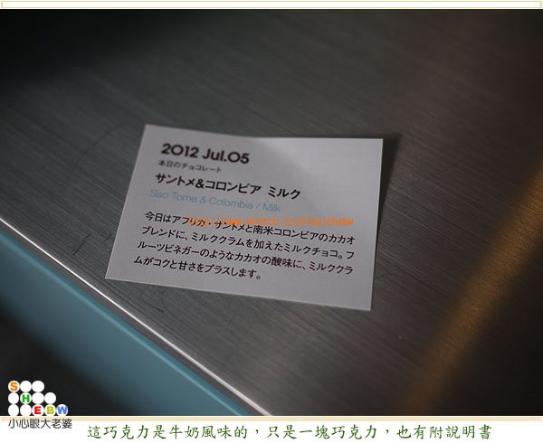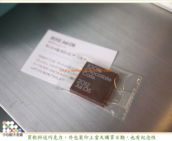 贈送的巧克力還真不含糊,還附上一張說明書,詳細地說明這塊巧克力的名稱和風味,透過這麼簡單的小東西,也讓人感覺到店家對巧克力的熱情~~