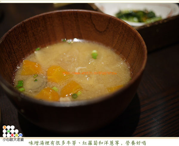 湯也好好喝,有我愛的蔬菜味增湯,裡面有很多牛蒡、紅蘿蔔、洋蔥等,健康美味~~