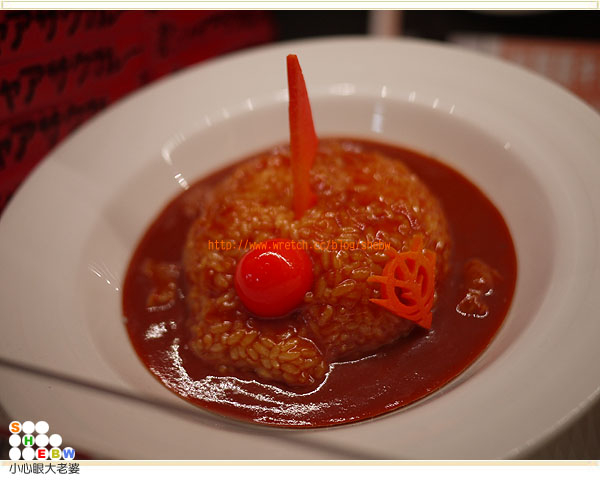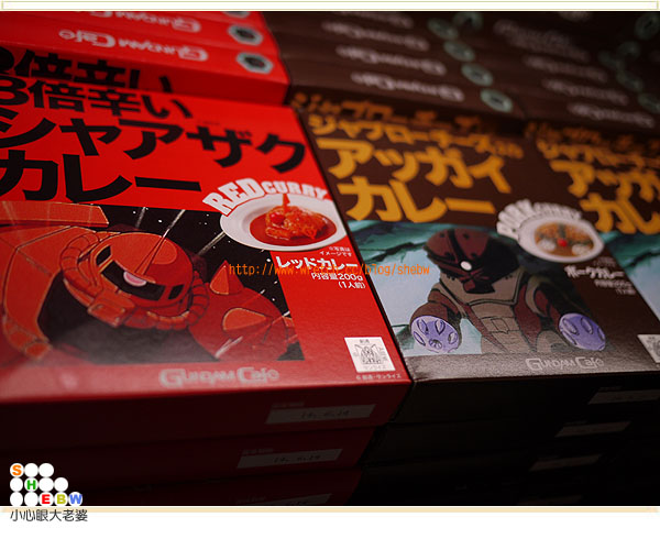 對了,還有鋼彈的咖哩飯,還有分紅咖哩和豬肉咖哩兩種口味,紅咖哩是仿照紅色彗星做的,包裝盒上寫3倍辛辣,絕對讓他吃到掉眼淚,就把它想成是為妳而流的感動的眼淚吧~~