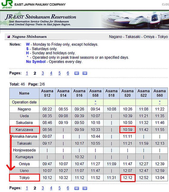 從東京到輕井澤的時刻表如下,買的時候要注意,有的車班停比較少站,車程比較短,大約一小時就到了,如果你買到停很多站的,車程就會被拉長到1小時20分喔。