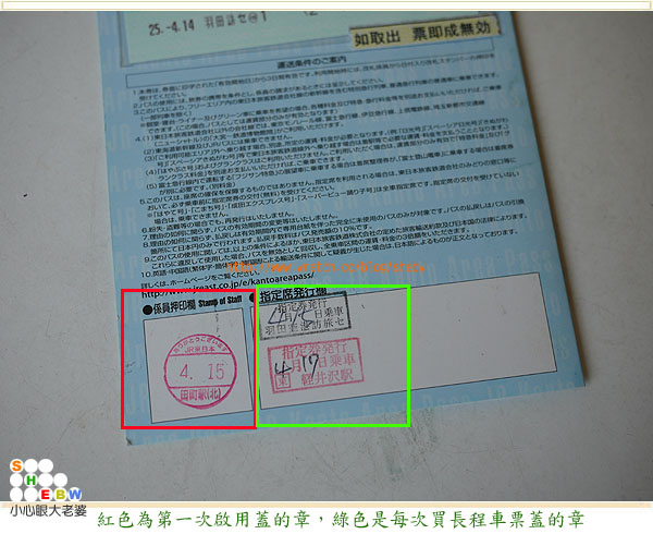 進出車站時,請走站務人員通道,同時出示這兩張(JR Kanto Area Pass和車票),給站務人員看;每次使用長程車票時,站務人員會在下方蓋一個章,這樣才有效。