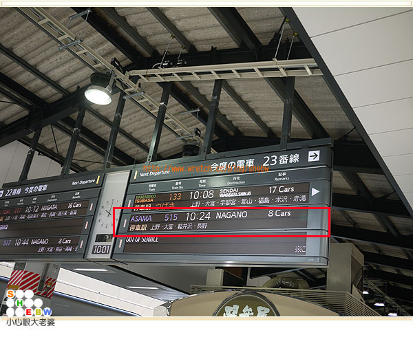 我們要坐的是10:24分往輕井澤、長野方向的新幹線,這班車從東京出發只停四站,上野、大宮、輕井澤、長野,痞子說每一台新幹線都有名字,這一班車叫做ASAMA,就在第一欄,Nagano是指往長野的方向,8cars是指8節車廂的意思。