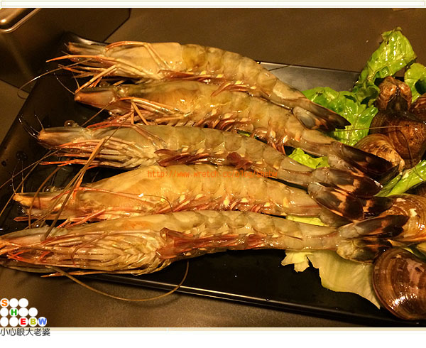 金鍋盃的蝦都好大隻,當天點的至少20公分,入鍋的時候有撇步,要先把蝦頭放進鍋裡煮一會兒,身體可以掛在鍋邊,蝦頭差不多之後,才把身體放入鍋中煮一下,才不會太老。